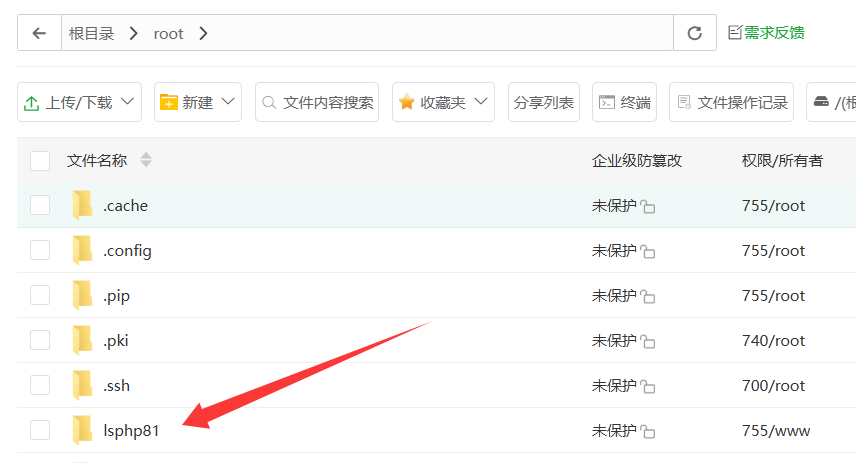把lsphp下载到本地之后,通过宝塔新建一个文件夹(我是从root文件夹下新建了lsphp81文件)如下图: