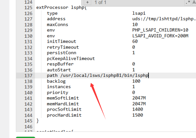 OpenLitespeed和lsphp都安装成功后,需要互相绑定,通过宝塔找到OpenLitespeed的配置文件,把Path路径输入到extprocessor lsphp中,路径是创建的lsphp81的路径下的lsphp文件哦,然后保存一下。