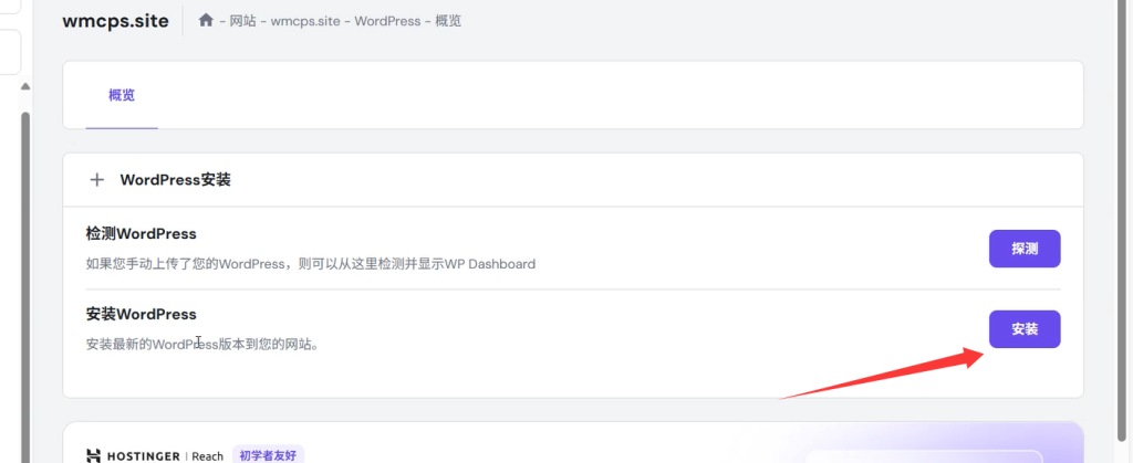 点击网站下的 WordPress安装 按钮,通过Hostinger快速安装Wordpress系统,如下图: