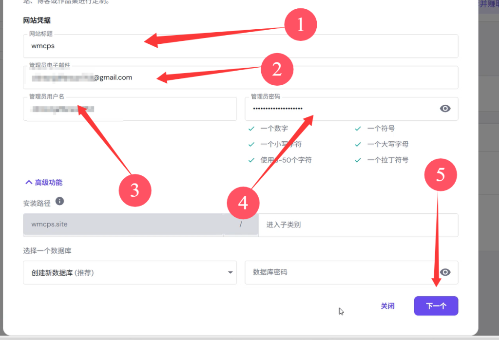 把网站标题、邮箱、用户名、密码创建一下,其他的直接默认就可以。