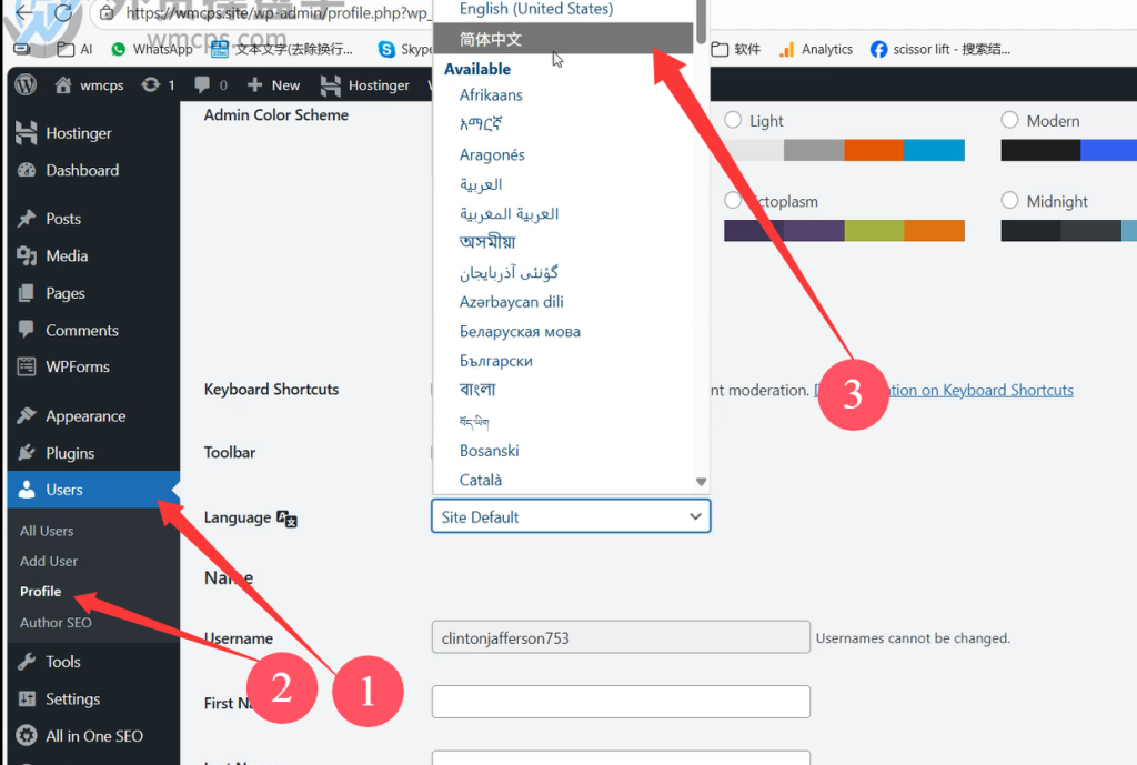 刚进网站后台后,默认语言是英文,咱们需要把语言改成中文。
