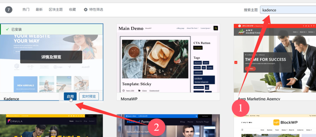 点击 外观 功能,之后点击 主题,之后点击 添加主题,通过搜索框中输入 kadence ,点击安装并且启用。如下图: