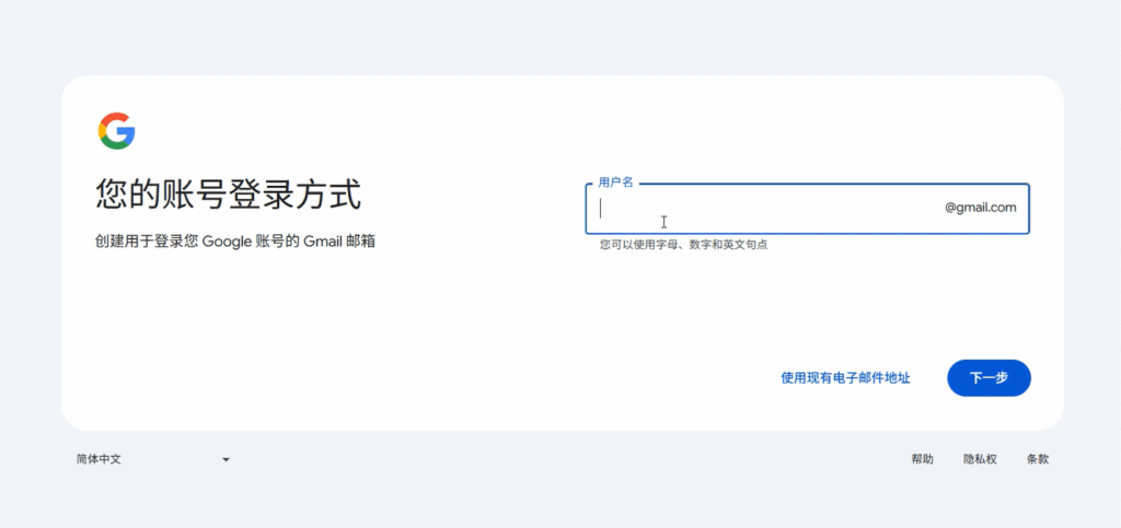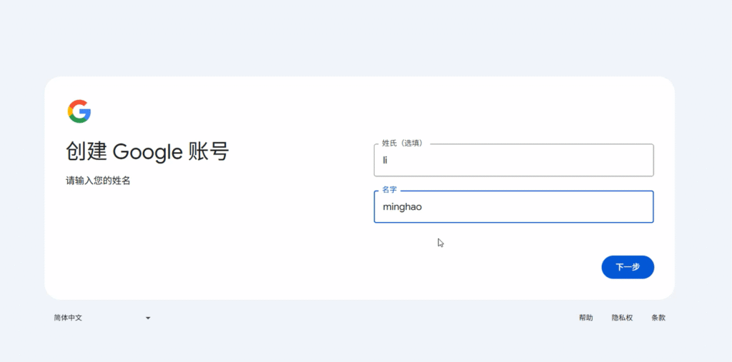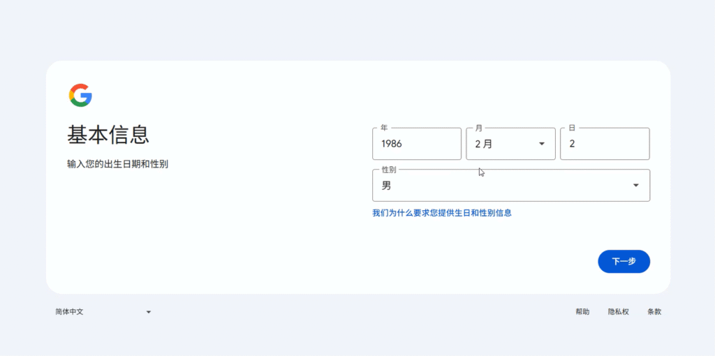 三、进入到注册界面后,后边需要创建姓名、出生年月、性别、谷歌邮箱前缀、密码等信息,填写完毕后,最好记得小本本上,我是记在有道云笔记中。