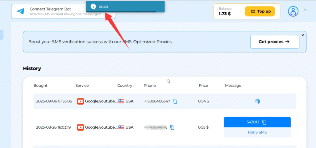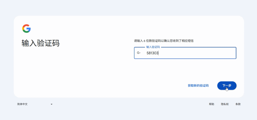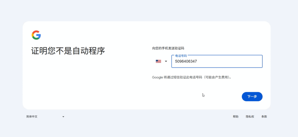 四、进入到手机号接码界面,由于中国大陆手机号很难接收到手机验证码,所以这里需要一个接码平台,我是用的 Sms-man.com,个人觉得用的还行,不成功不收钱。注册sma-man.com 的账号后,充值后(一开始冲个几块钱就行),购买一个接码手机号接受验证码,把接受的验证码填写到谷歌验证界面中即可。