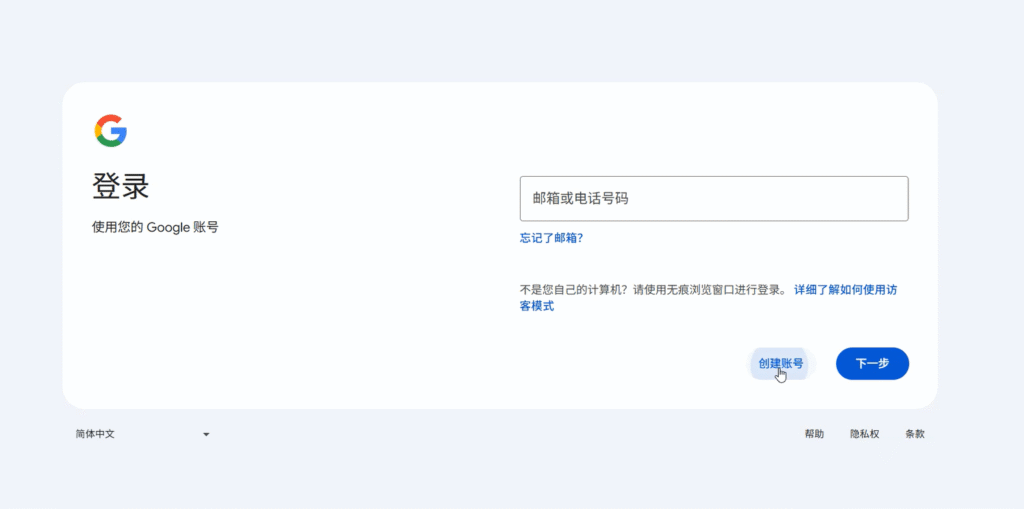 二、点击右上角的登录按钮,进入到谷歌登录界面,由于我们没有谷歌邮箱,所以再点击页面右下角的创建账号,再点击个人用途,进入到注册界面。