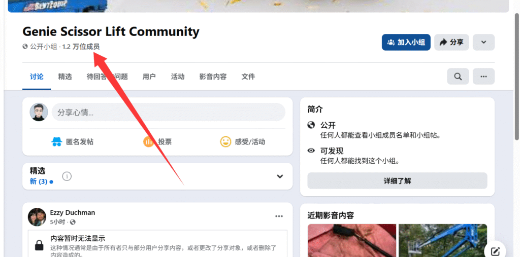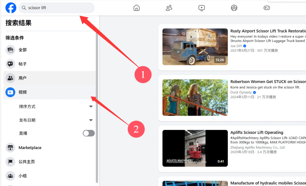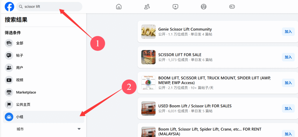 先通过搜索框输入关键词:Scissor Lift ,然后点击导航下方的小组功能,然后右边就会列出所有关于 Scissor Lift 产品的群组。