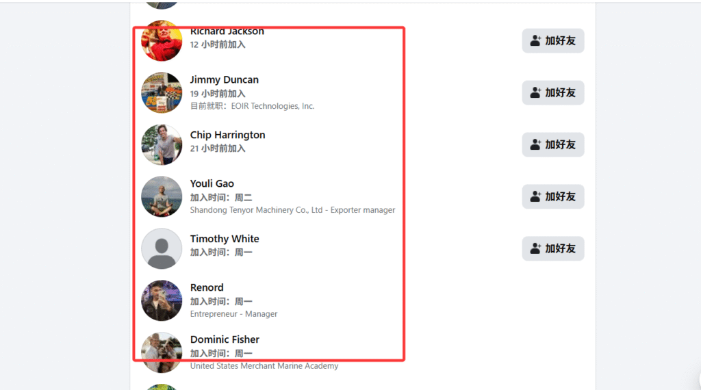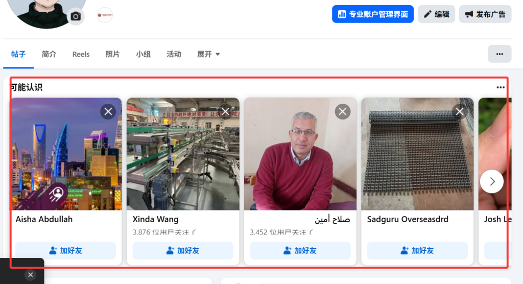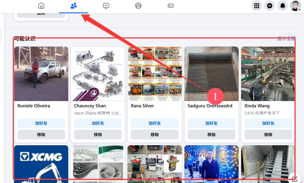 1、点击Facebook上方的朋友按钮,会出现很多相关好友(Facebook系统认为和你行业相关或者可能认识的人),推荐给你,根据头像和个人信息筛选后,添加合适的人即可。如下图: