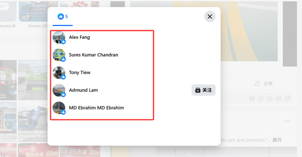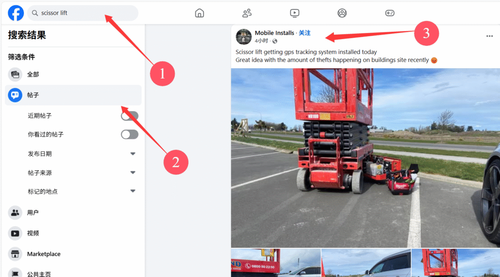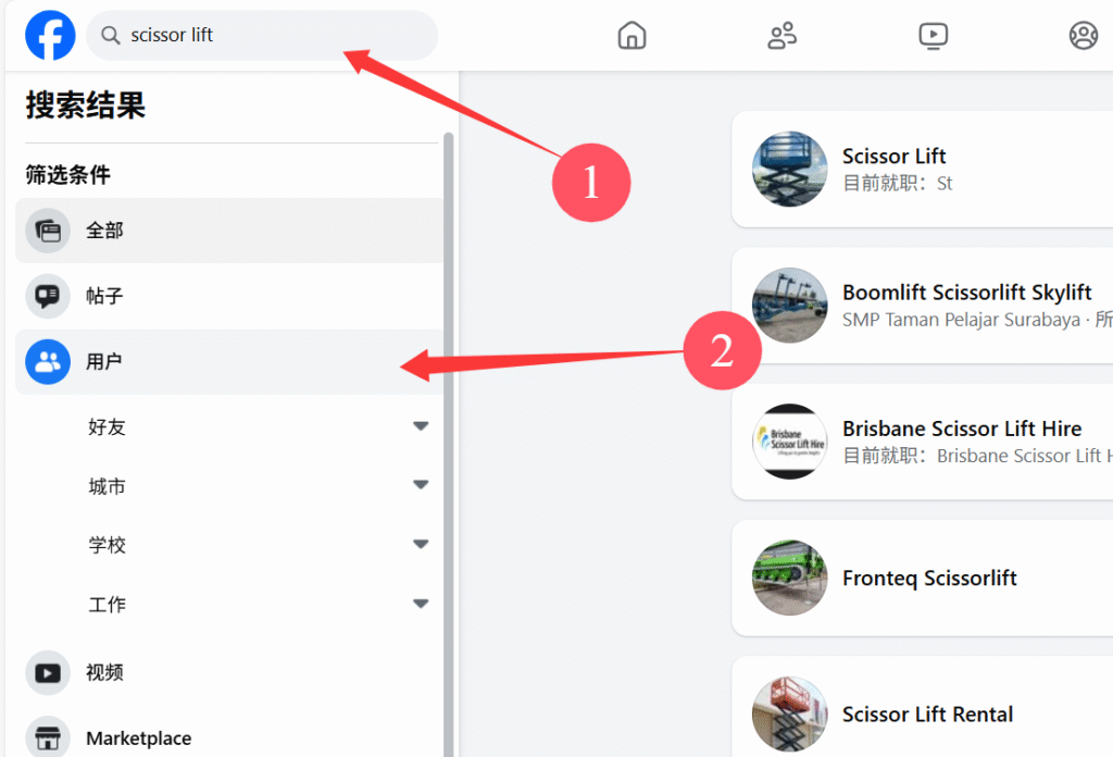 通过Fackbook添加好友来开发客户也是一种常见的方式,基本上常见的添加好友方式有以下七种。咱们还是以 剪叉升降机 为例: