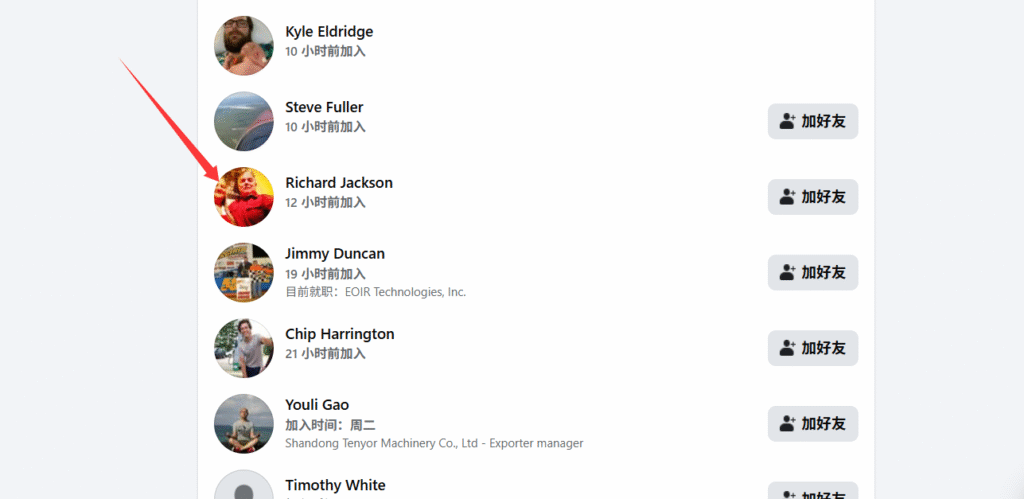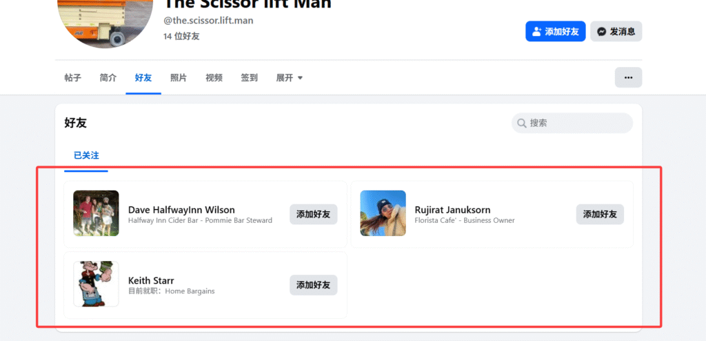 以上这几种方式是可以帮助咱们找到精准的用户,同样也可以根据这些用户的个人主页,查询出这些好友,来进行再次添加,如下图: