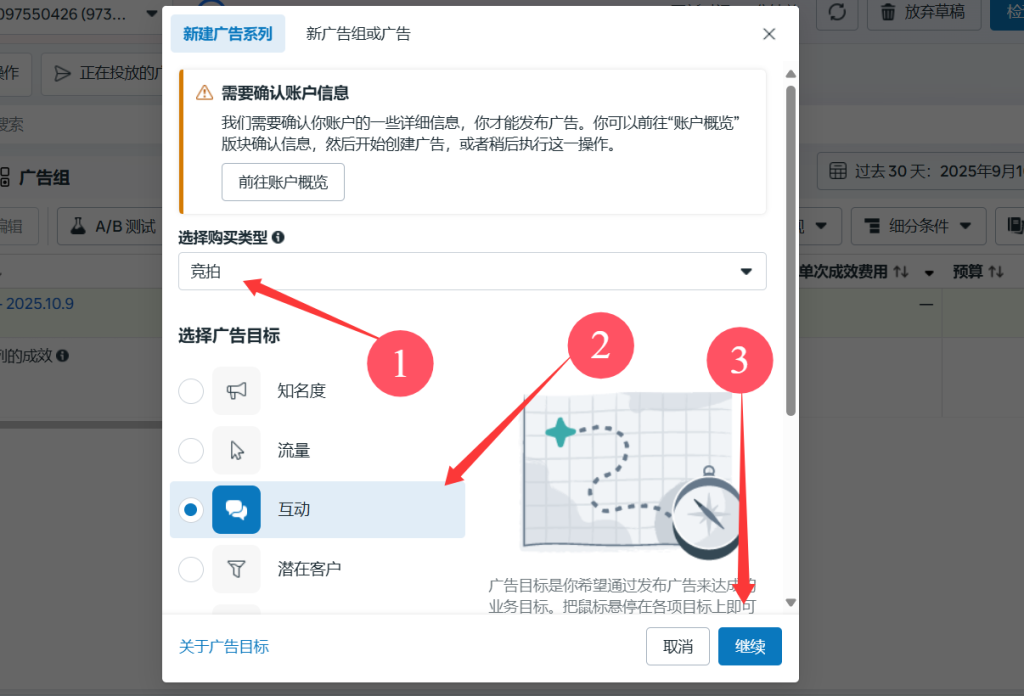 界面中会看到 选择购买类型 和 选择广告目标 两个功能,由于咱们是做B端的外贸推广,那么购买类型建议选择第一个竞拍,广告目标建议选择其中的三个:潜在客户、互动、流量,这三个更适合B端的推广。这期咱们以互动为案例。之后点击一下继续,如下图: