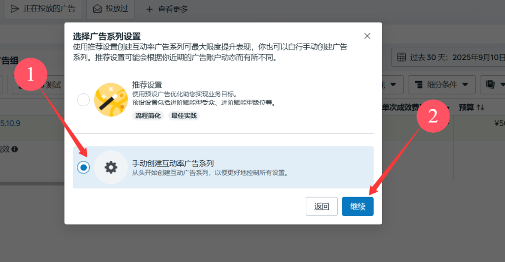 进入到 选择广告系列设置 界面中,会看到两个选项,一个是 推荐设置,一个是 手动创建互动率广告系列,我一般选择第二个。因为全手动的设置,更适合我后期优化广告。之后点击继续,如下图:
