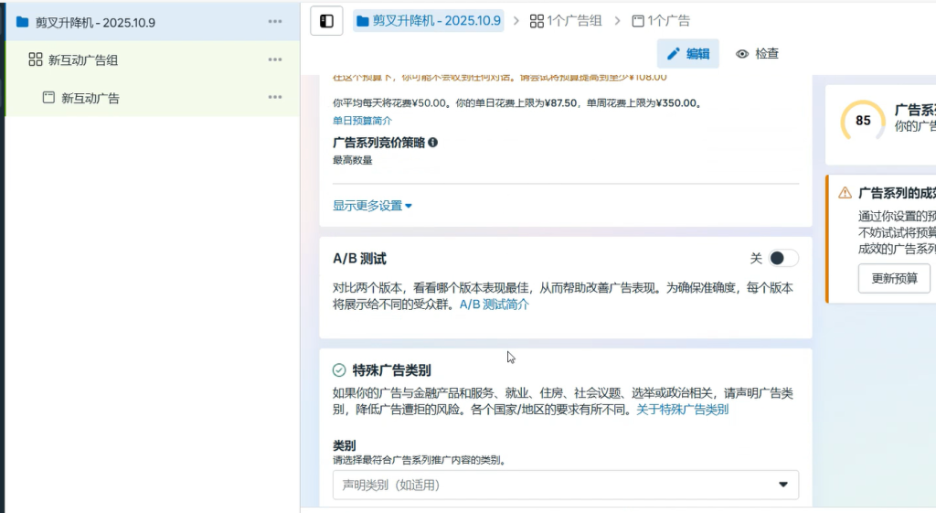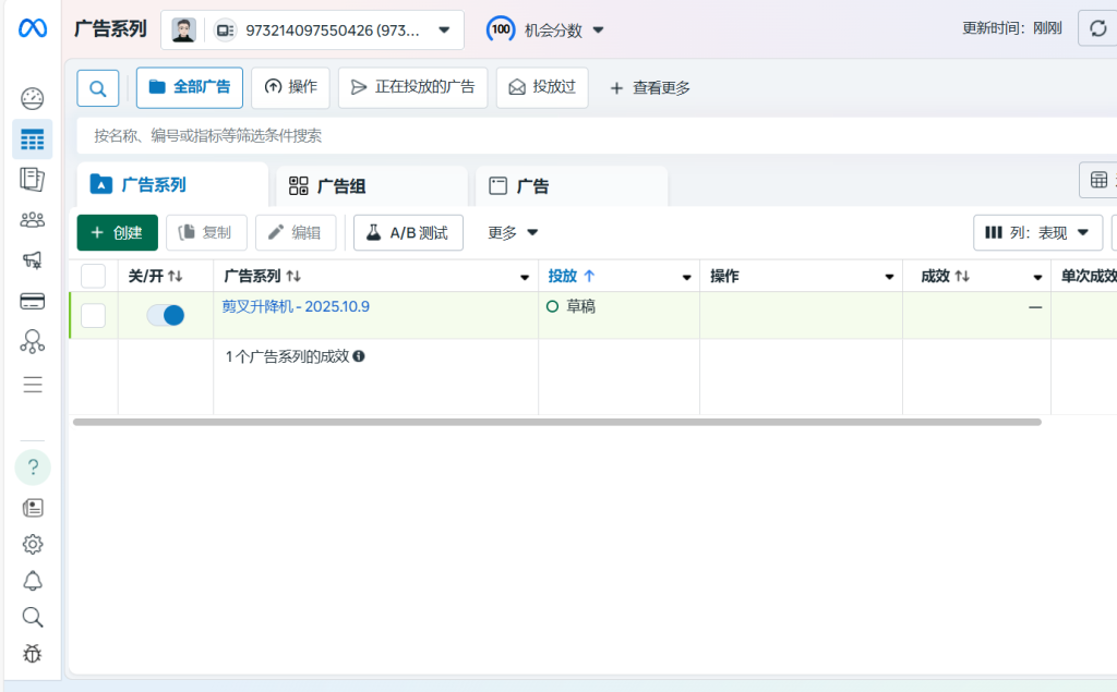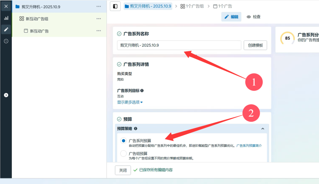 首先先给广告系列起一个名字,我一般根据 产品和日期来命名 广告系列。就以:剪叉升降机为例,那么我的命名格式为:剪叉升降机 – 2025.10.9 。