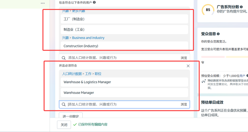 进阶赋能型受众:年龄范围我一般选择 25岁 ~ 50岁,对于B端来讲,这个年龄段是比较符合的。性别默认(所有性别或者男性)。细节定位中选择兴趣,还是以剪叉升降机为例,兴趣可以选择:工业、仓库、工厂等等,这几个兴趣比较符合剪叉升降机的客户群体。其次进一步的筛选,可以通过职位进行筛选。在公司中,拥有话语权往往是经理级别的人,所以可以根据关键词 “manager“来选择职位受众。如下图:
