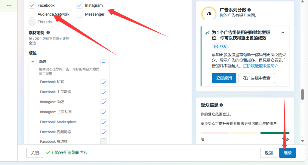 版位设置:我们设置的广告会投放到Facebook,ins,Reel等旗下的产品,但是真正效果好的版位,经过多次测试还是以:Facebook和Ins为主。所以我们只需要选择手动版位中的Facebook和Instagram就可以足够了。当然你也可以根据后期的数据变化选择合适的版位。之后点击继续,如下图: