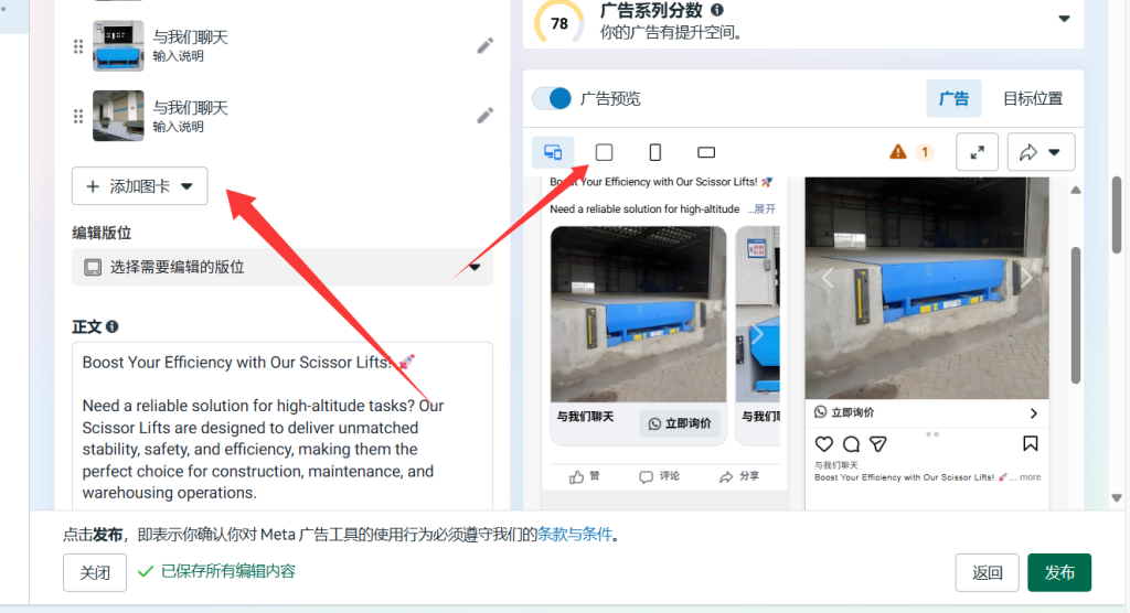 广告创意:当上边你的广告设置成单图片/单视频/轮播,这里会和上边你的设置对应起来,通过这里上传图片、视频,并且可以对视频或者图片裁剪、美化,加背景音乐等等,从而让素材更好看,转化能力更强。并且可以给图片或者视频设置标题或者说明。设置成功后,可以从右边进行预览。如下图: