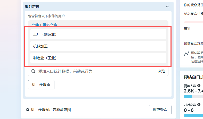 这款产品主要用于各种工厂,那么就可以通过Facebook的受众中,找到关于工厂的兴趣。