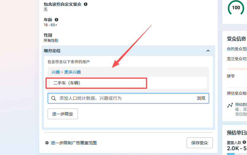 当然,也是有很多简单的产品,例如:二手车,这种产品只需要通过受众里搜索 二手车 即可,如下图:
