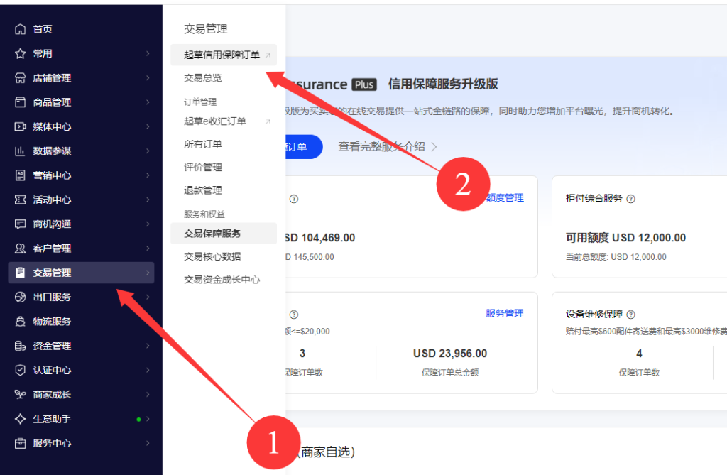 1、打开阿里国际站后台,交易管理,点击起草信用保障订单,如下图: