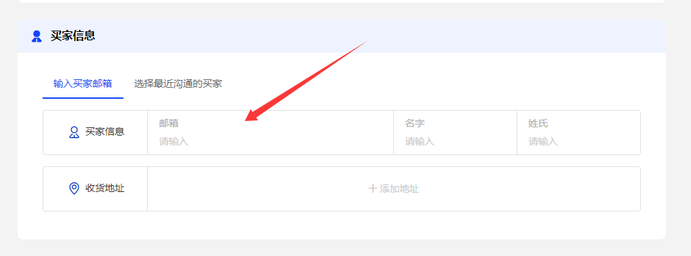 邮箱一定要写入正确(确定好这个邮箱是阿里国际站买家的注册邮箱),把邮箱填入后,自然会生成对应的名字和姓氏。收货地址一般是需要你自己填写的。也有个 选择最近沟通的买家 功能,可以直接忽略,因为咱们得客户是从Facebook来的,所以不用管它。