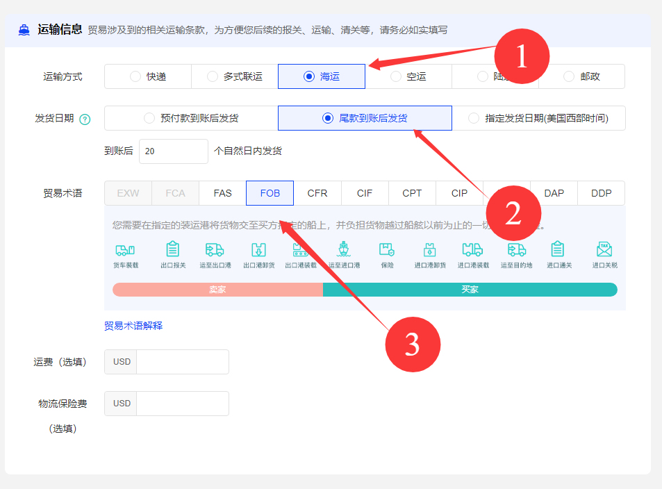 快递一般指的是发到国内的物流,常用于客户有合作的货代,咱们把货物发货到对方的货代,之后咱们就不管了。运费和物流保险费一般我都不填的,因为我会把总价都加到产品信息那里去了。(贸易术语选择EXW)