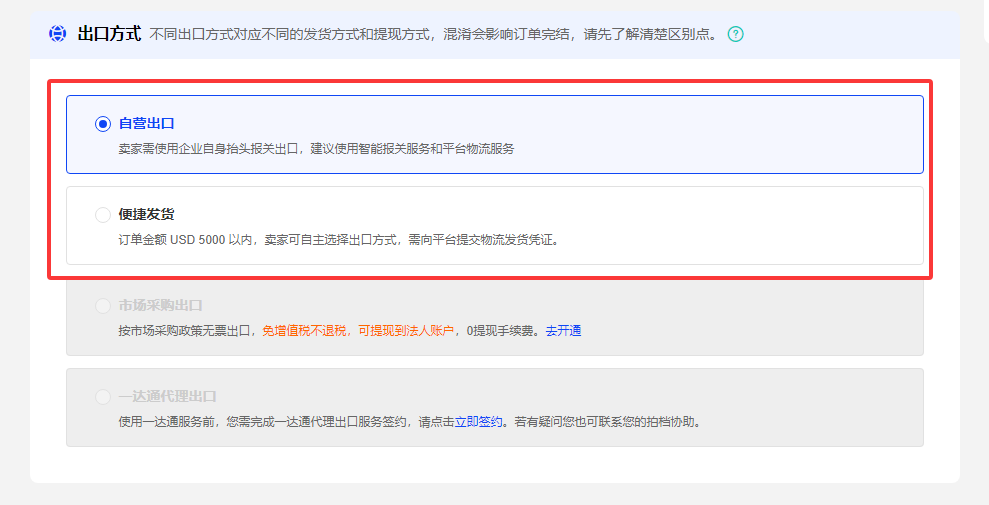 出口方式一般是:自营出口或者便携发货。一般没有出口资质的企业会选择第二种便携发货,从而让货代公司买单报关。有出口资质的一般都是选择自营出口,因为可以退税。(买单报关的企业无法退税哦)