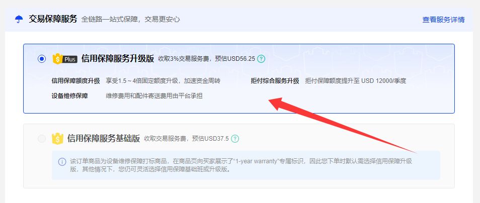 现在默认都会选择第一个 信用保障服务升级版,只是会收3%的交易服务费。所以说大家在算总价的时候,注意一下。