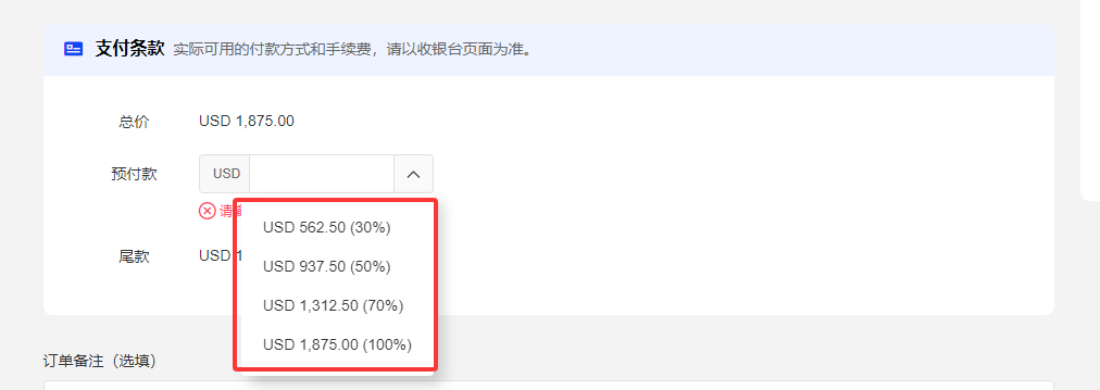 预付款有四种交易方式,30%、50%、70%、100%。(发货前结清尾款)。可以根据自己的需求,与客户的沟通选择适合的交易方式。如下图;
